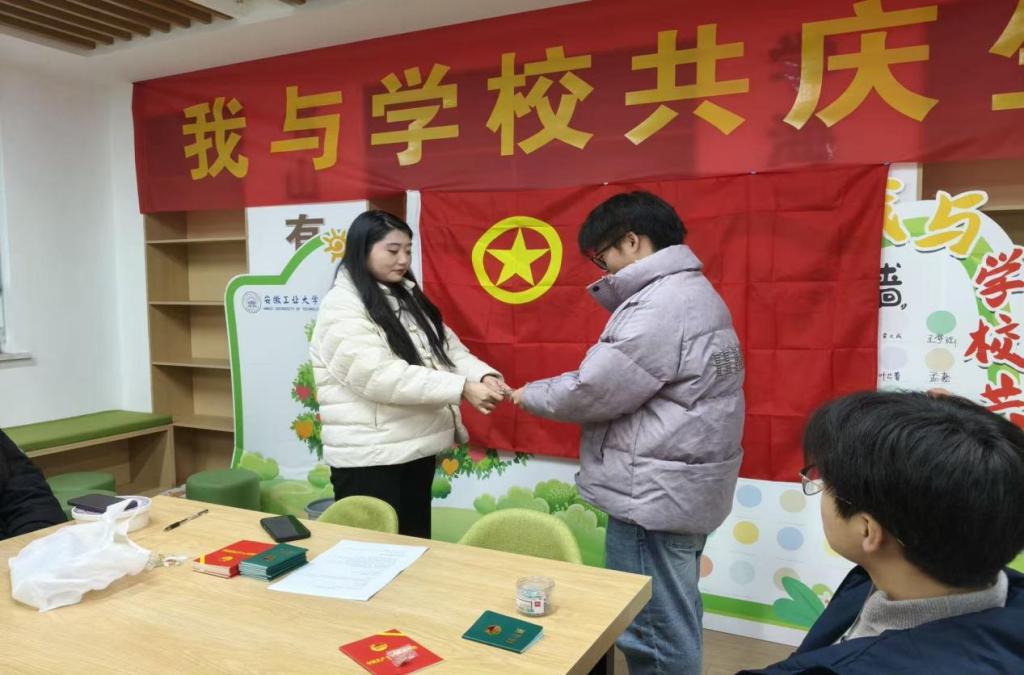 仪式在雄壮激昂的国歌声中拉开帷幕,全体师生肃立致敬,激昂的旋律激荡着现场的爱国热情与青春壮志。随后,辅导员郑重宣读了新团员名单,每一个名字的响起都承载着组织的认可与殷切期望。宣读完毕后,老师们为新团员颁发了团员证与团章,并佩戴了团徽,熠熠生辉的团徽不仅是身份的象征,更是沉甸甸的责任与使命,团员证与团章则是团员政治生命的起点和行动的根本遵循。
