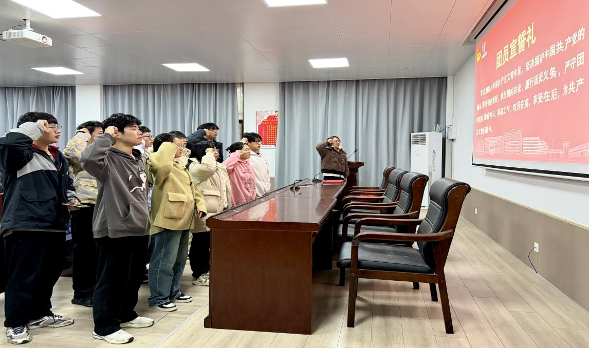 在辅导员的领誓下,全体新团员面向鲜红的团旗,高举右拳,庄严宣誓:“我志愿加入中国共产主义青年团,坚决拥护中国共产党的领导……”,铿锵有力的誓言在教室中回荡,表达了新时代青年坚定的理想信念与永远跟党走的决心。