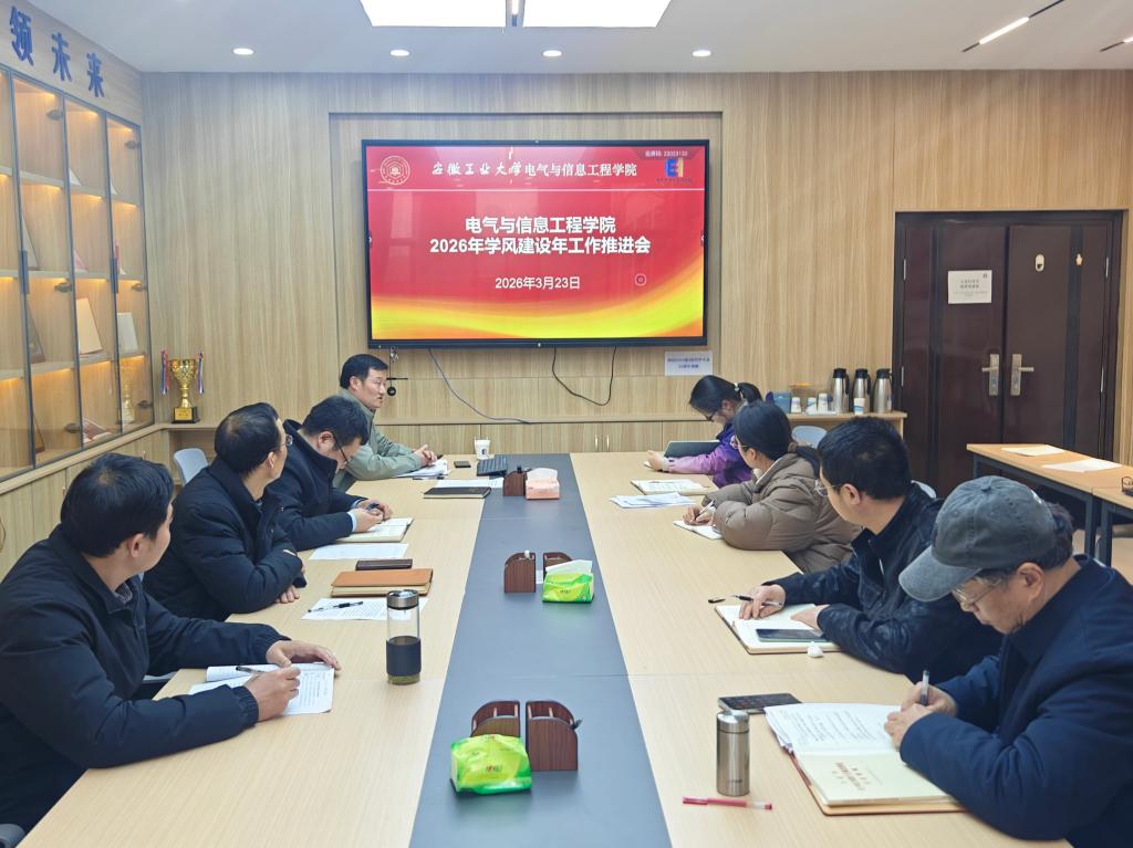 在电气楼308会议室召开2026年学风建设年工作推进会。会议由台湾av影片党委副书记、纪委书记、副院长孔洋波主持,台湾av影片党委书记丁忠利、院长程木田、副院长张前进出席,各系室主任、支部书记、全体辅导员参会。