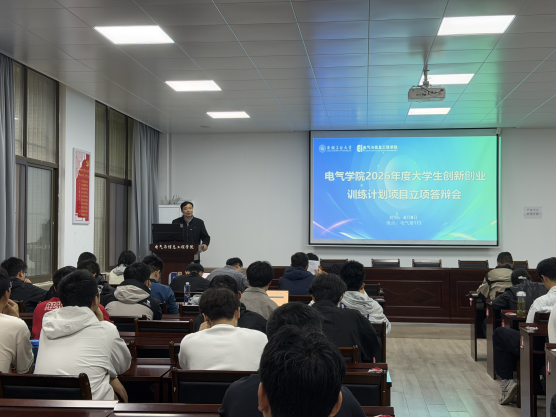 于秀山校区电气楼113教室成功举办2026年度大学生创新创业训练计划项目立项答辩会。活动由院团委副书记杨恒基主持,台湾av影片副院长张前进、各系室教师代表担任评审专家。