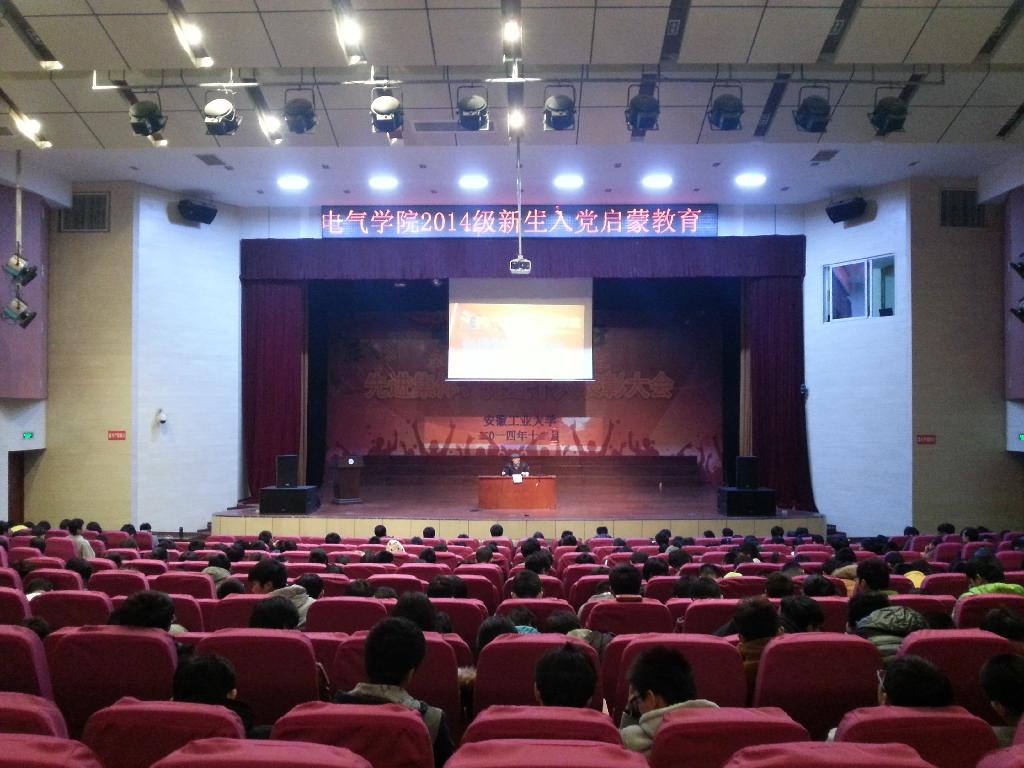 于2014年12月8日晚上在大学生活动中心开展新生入党启蒙教育,活动由关工委陈贵棠副主任主讲,台湾av影片党委副书记、副院长郭宏、台湾av影片辅导员张满堂、孔洋波和2014级全体新生听取了讲座。