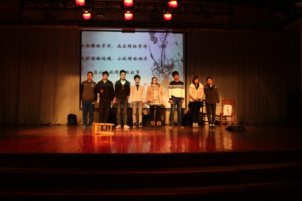 大一每个班分别派出的一支队伍组成,每支队伍对此次话剧演出均做了充分的准备,在内容的选择上也非常贴近大学生在日常生活中所遇到的各类问题。有复古但不失搞怪风格的荆轲刺秦王,有爱恨别离的儿女情长,有活泼可爱的作弊男孩,还有强装高冷的老师……值得一提的是自143班的原创剧本《后山上的妖精们》,故事讲述了一个只有半个灵魂的骷髅阿呆,一直在寻找自己的另一半灵魂。最终,在黑袍大妖怪身上找到了,虽然其他的妖怪笑话它,喜欢他的画皮精不理解他,连黑袍大妖怪也因为自己的卑微黑暗排斥与他的相见,但他却承认了另一半灵魂的不堪,并最终接受自己,剧末,拥有完整灵魂的骷髅中长出了新鲜的血肉。这个剧本因内容的新颖、主旨的深度赢得了老师、同学们的一致赞扬。