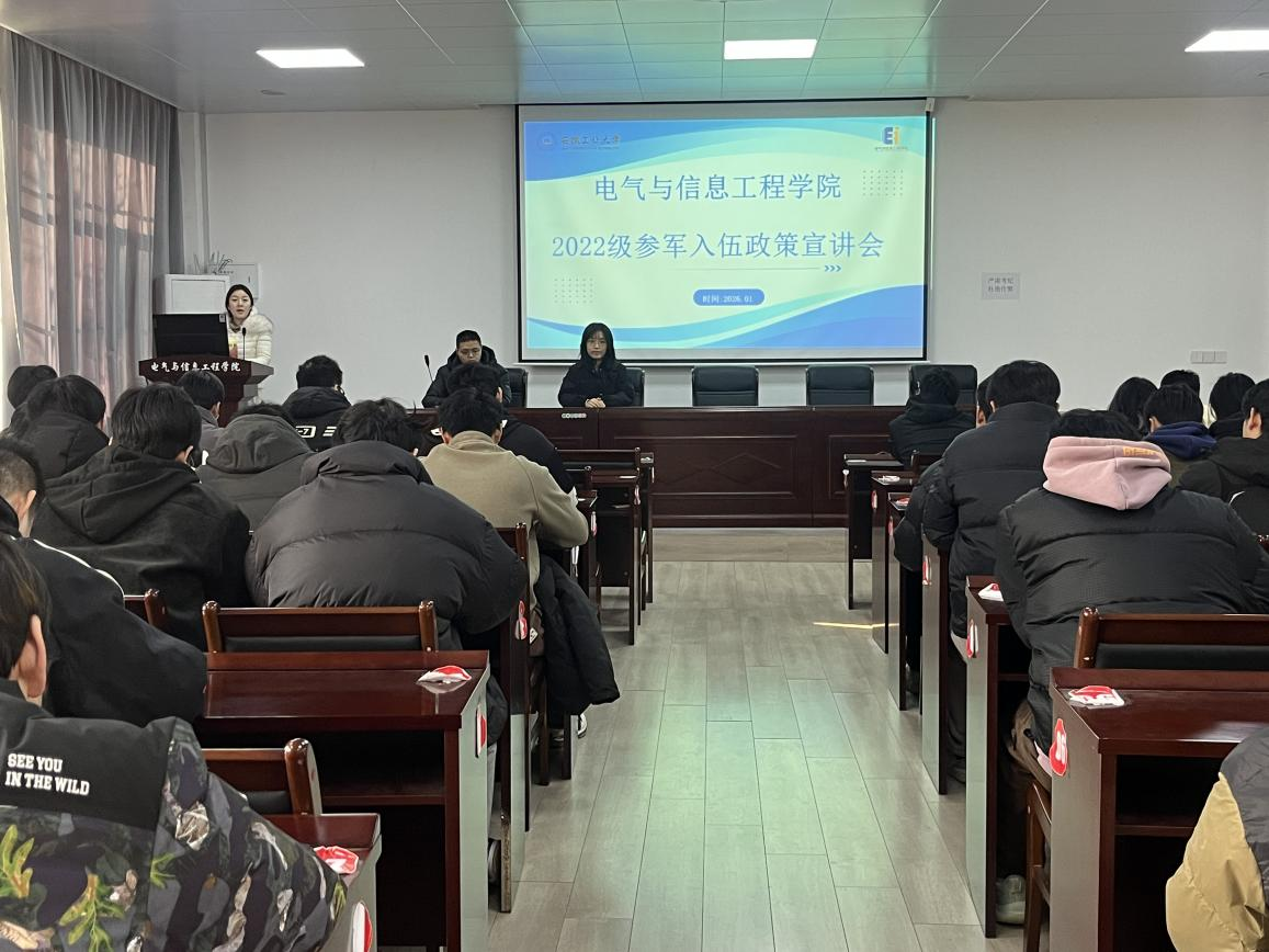 在电气楼113举办2026届毕业生参军入伍政策宣讲会,会议由辅导员甘如美江、杨恒基、孔瑜琦共同主持,全体毕业班学生参会。