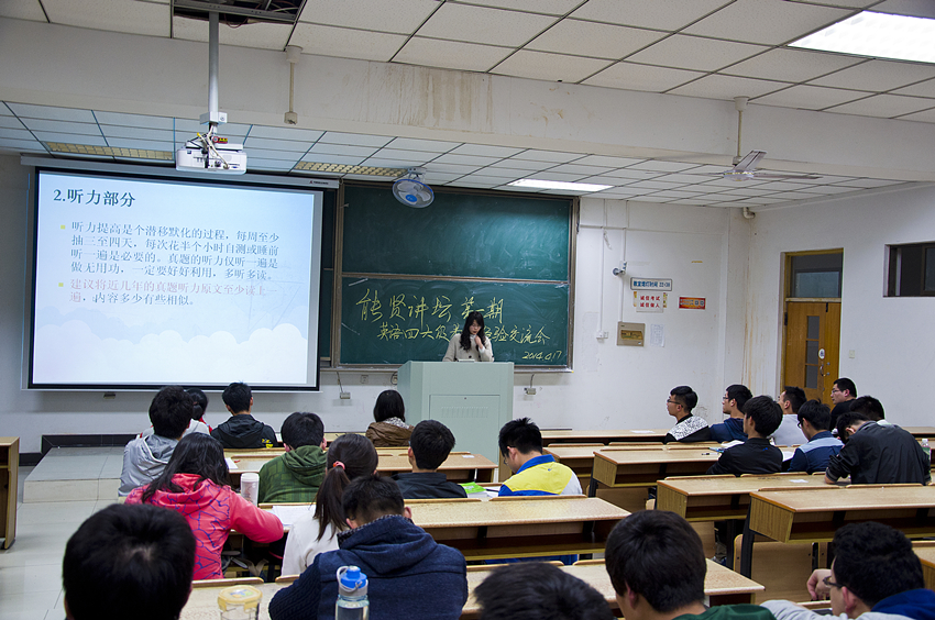 会前,辅导员徐悦和尚全邀请了向秋炜、何流、童子昂、鲍胜楠、鲁珍珍、武梦娇等六位本年级英语四六级考试获得高分的同学走上能贤讲坛,讲述他们的复习之路和应考经验。六位同学分别就英语学习兴趣、大学英语学习、四六级复习技巧、考试备考技巧、考试流程等方面,结合自身经历向大家做了详细说明。