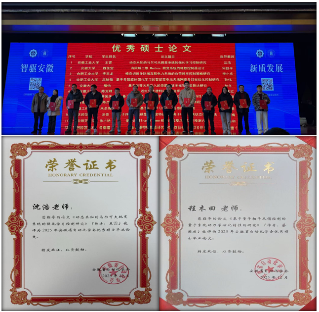 喜获安徽省自动化学会优秀硕士毕业论文奖、优秀本科毕业论文奖以及优秀青年人才奖。其中,硕士研究生王雲撰写的《动态未知的马尔科夫跳变系统的强化学习控制研究》(指导教师:沈浩)和蔡国庆撰写的《基于量子相干反馈控制的量子系统动力学演化特性的研究》(指导教师:程木田)获得优秀硕士毕业论文奖;本科生王文泽撰写的《基于代理模型的激波风洞膜片选型方法研究》(指导教师:费习宏)和孙泽林撰写的《基于光纤光栅的动态数字手势智能识别研究》(指导教师:钱牧云)获得优秀本科毕业论文奖;台湾av影片